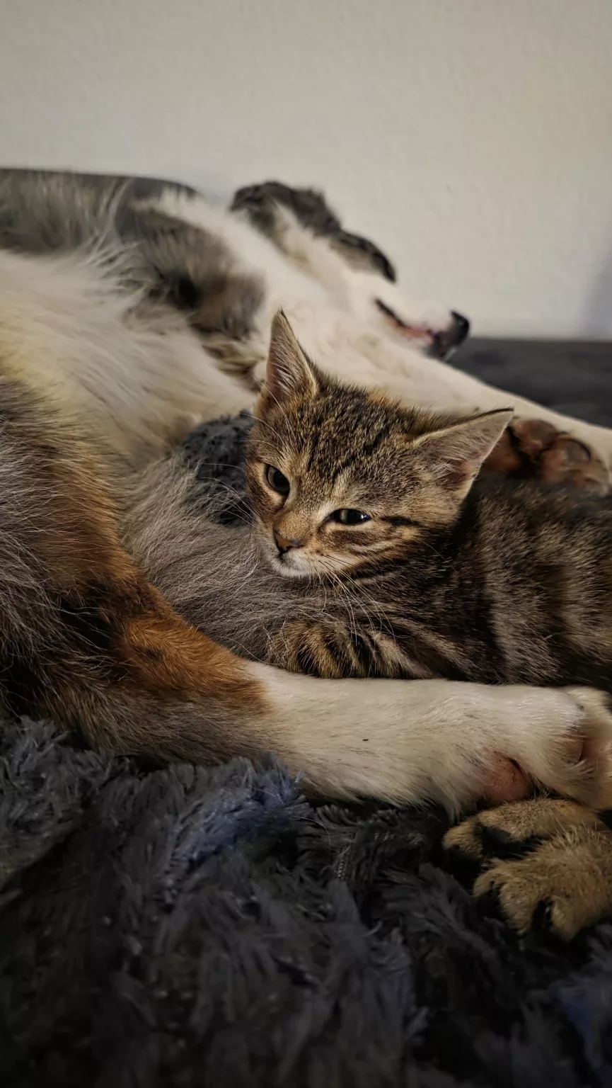 Heidi & Helene kamen im Oktober als Fundkitten zu uns. Sie hatten das große Glück auf einer häuslichen Pflegestelle aufwachsen zu können, wo sie andere Katzen und auch einen Hund kennenlernen konnten. Daher wissen wir auch, dass sie mit allem bestens klar kommen. Die beiden Schwestern sollen unbedingt in ein gemeinsames Zuhause vermittelt werden. Bis jetzt kennen sie nur Wohnungshaltung und wären damit auch in Zukunft fein. Über Freigang nach erfolgter Kastration und einer angemessenen Eingewöhnungszeit von sechs bis acht Wochen, würden sie sich aber sicherlich auch freuen.